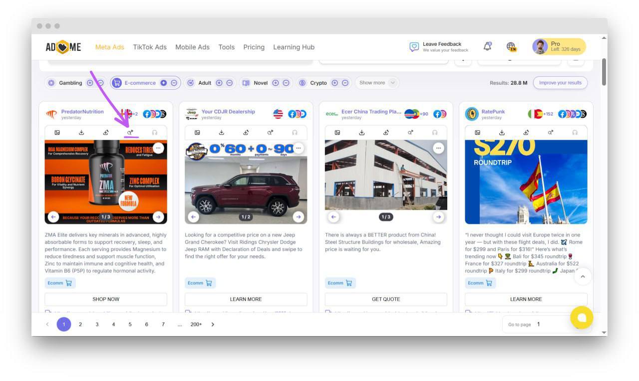 This allows you to find variations of the same approach faster, analyze how creatives scale, and understand what ideas other advertisers are using.