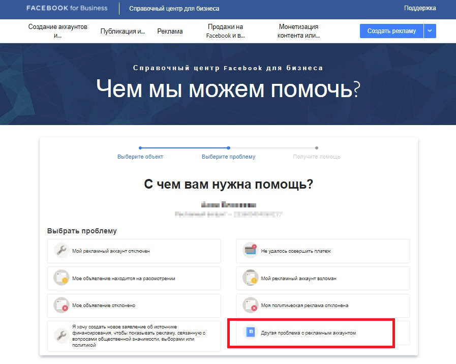 - Dirígete al Centro de Ayuda de Facebook para Empresas. Aquí encontrarás consejos, instrucciones y guías para utilizar de manera más efectiva las herramientas y solucionar problemas. Todas las respuestas están convenientemente organizadas por categorías. Los usuarios regulares de Facebook no pueden acceder al soporte desde aquí, pero las personas que trabajan con arbitraje de tráfico trabajan constantemente con publicidad y gastan grandes sumas en promoción pueden hacerlo (Facebook no proporciona datos exactos). Para ellos, hay un botón "Comenzar". Haz clic en él, elige una de las cuentas publicitarias (si tienes varias) y selecciona "Otro problema con la cuenta".