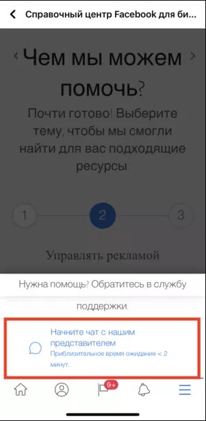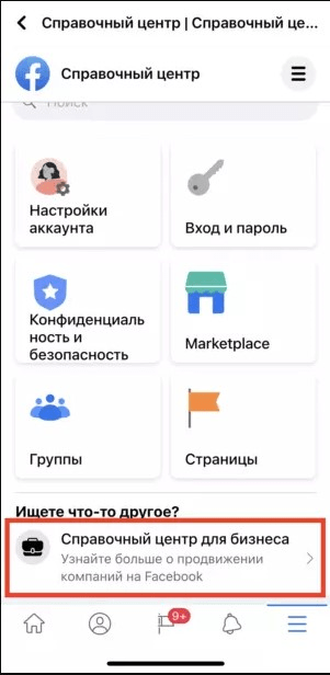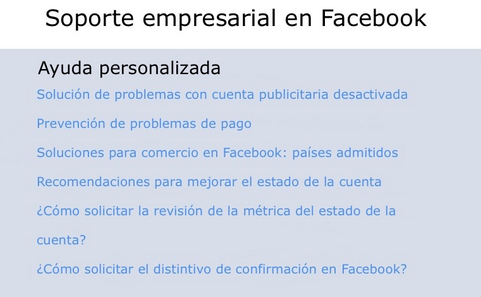 - Abrir la página oficial en la dirección https://www.facebook.com/business/help/support. Aquí se encuentran respuestas predefinidas a preguntas frecuentes de los usuarios. No es posible enviar un correo electrónico por separado.