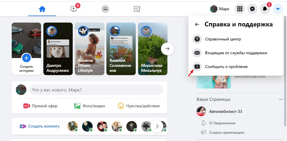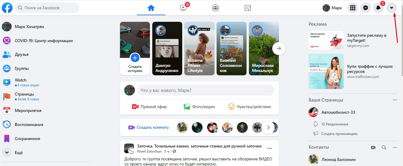 - Haz clic en la flecha en la esquina superior derecha de la página principal de Facebook;