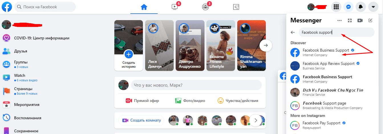 - Escriba 'Facebook support' en la ventana de búsqueda y seleccione el destinatario adecuado.