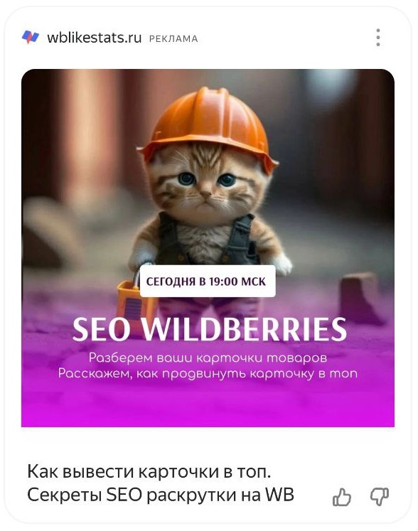 Un gatito atrae la atención hacia el seminario web sobre cómo trabajar con mercados. Seguimos sin entender por qué lleva un casco de trabajo y por qué hay un gatito en esta creatividad, pero el anuncio sigue siendo memorable, así que funcionó.