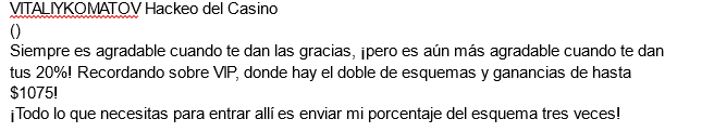Uno de los métodos más exitosos para conducir tráfico de esquemas en la industria del juego es a través de publicidad en Facebook. Una vez que un posible cliente hace clic en el anuncio, son dirigidos a un canal de Telegram donde se les prepara durante 5-7 días antes de recibir un enlace a un casino. Después de eso, se les envía un esquema en mensajes privados, que se les anima a ejecutar.