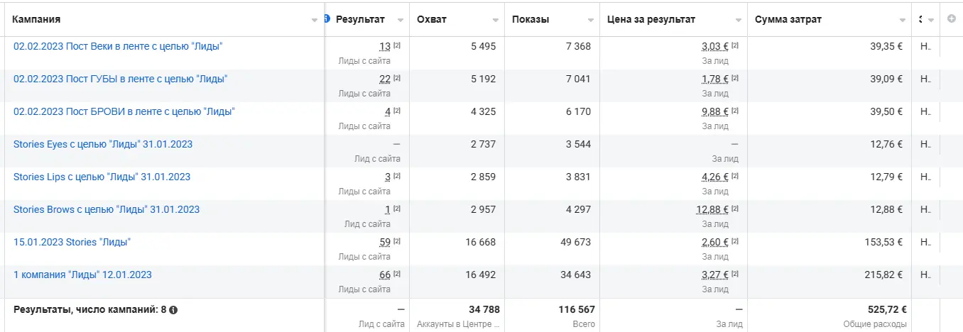 Lembramos que o objetivo deste trabalho era obter um fluxo constante de solicitações qualificadas, de 2 a 3 por dia, a um custo de 10€ por solicitação (CPL), para o serviço de maquiagem permanente com preço de 180€ (média de 100€ na Espanha), voltado para clientes de língua espanhola no Instagram.