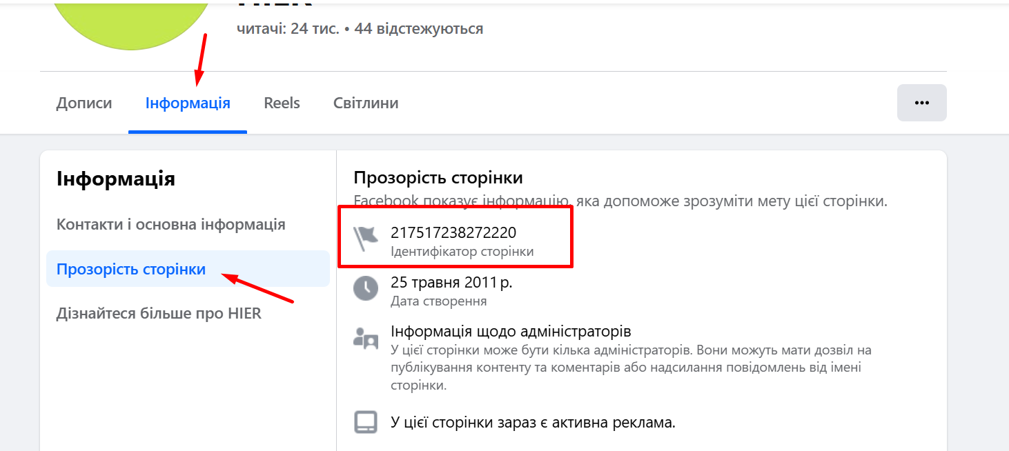 Все просто: заходите на нужную Facebook-страницу —> Информация —> Прозрачность страницы —> копируете ID и вставляете его в поисковое поле: