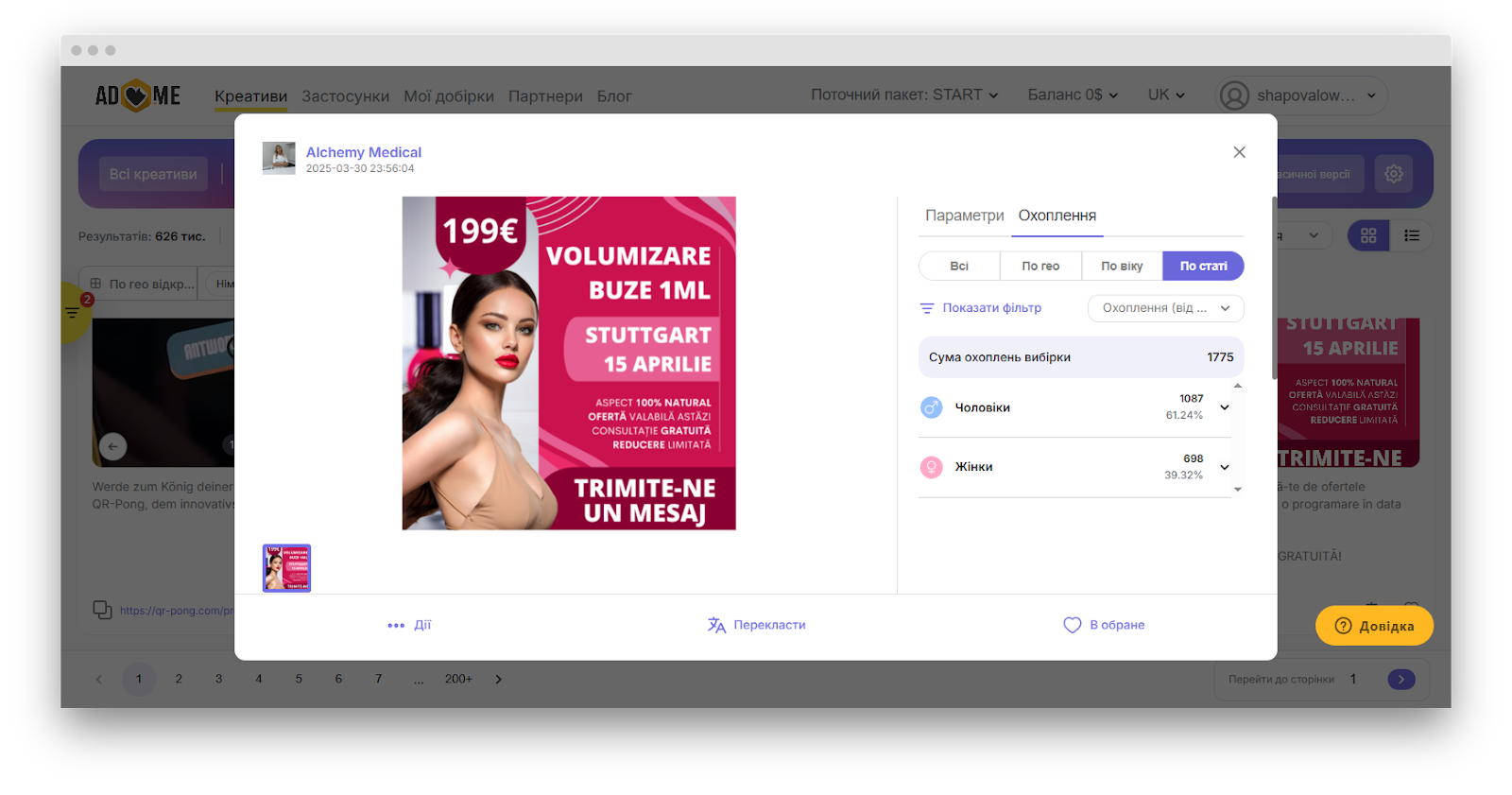 Воспользуйтесь спай-сервисом Adheart — он покажет, какие креативы сейчас активно крутятся в вашей нише, какие форматы и месседжи работают лучше всего. Это позволяет быстро адаптировать свои идеи к рынку.