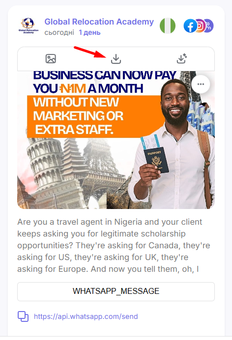 Коли знайшли потрібне оголошення, його можна скачати в оригінальній якості — як зображення, так і відео. Ніяких скріншотів чи втрати чіткості: ви отримуєте саме той файл, який використовував рекламодавець у Facebook чи Instagram.