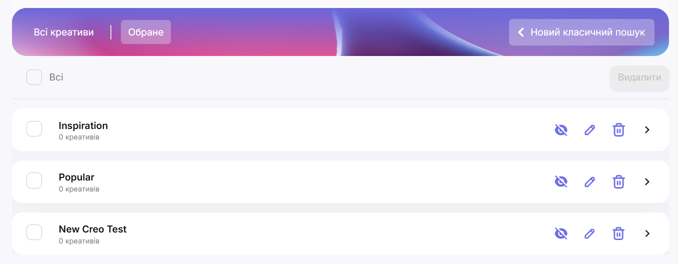 Це дозволяє швидко відсіяти непотрібне і знайти саме ті креативи, які вам цікаві.